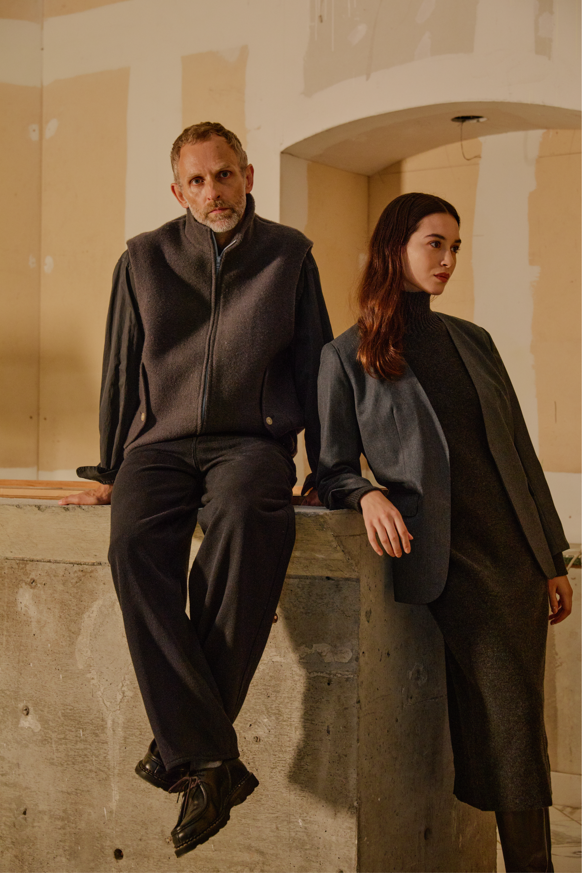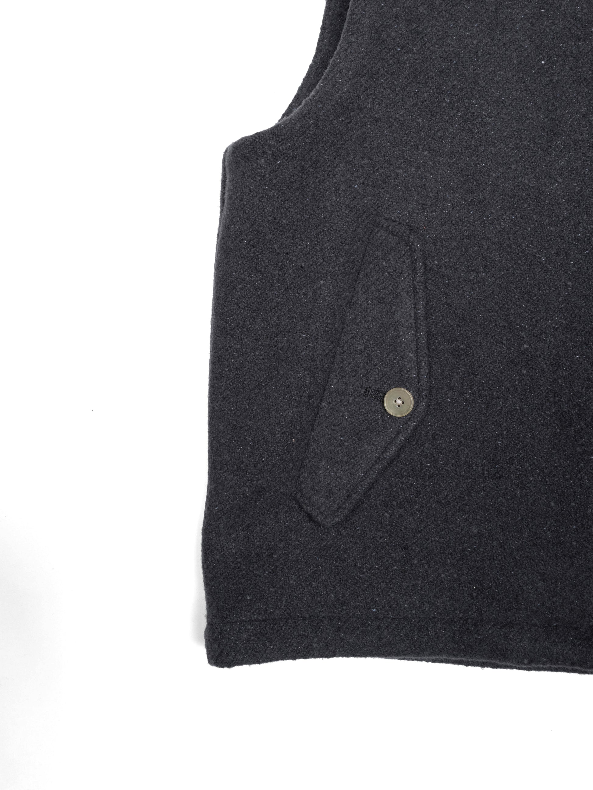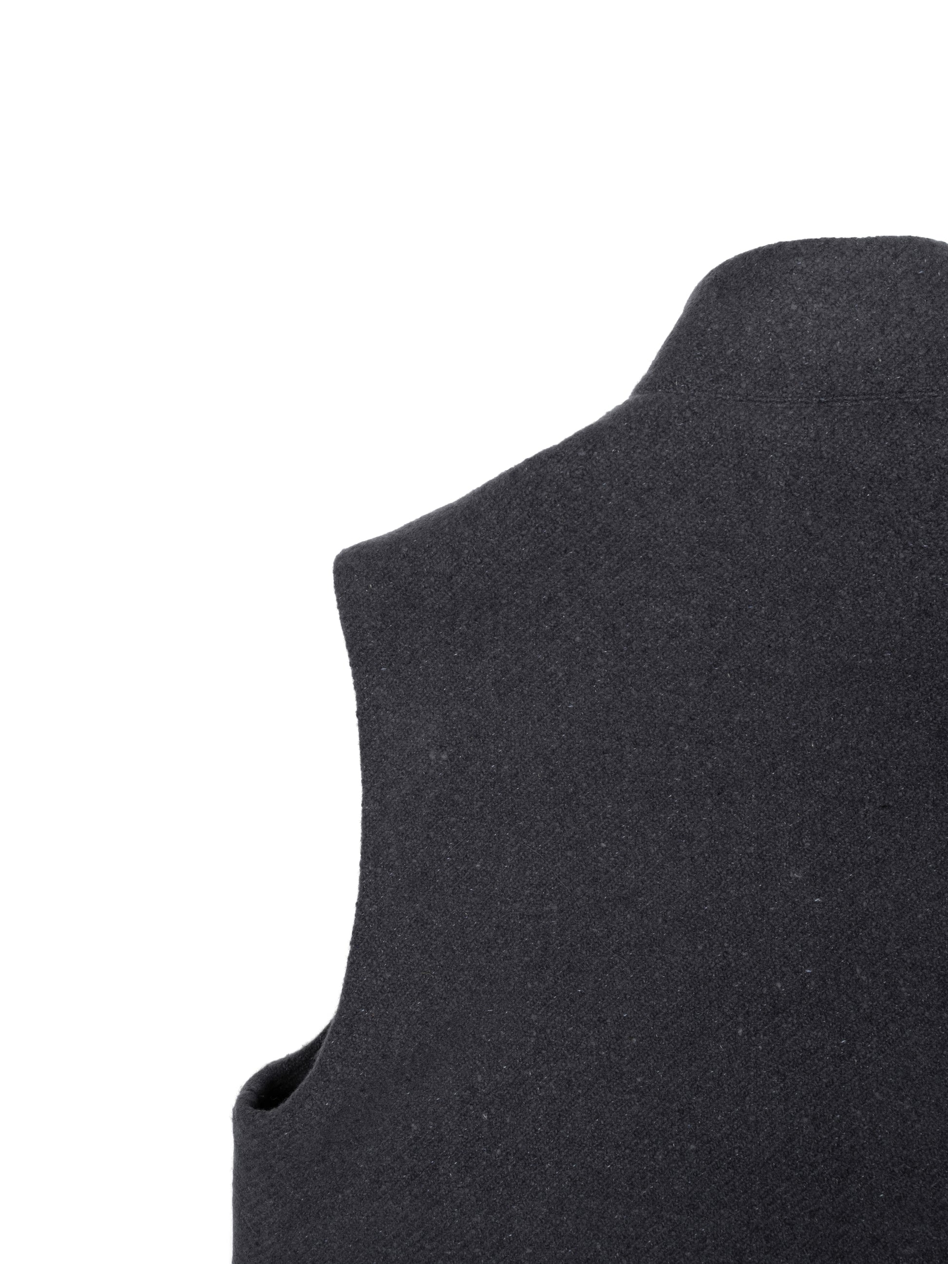 A stand collar vest made of rustic tweed material using original yarn wrapped with linen on Super140's class wool yarn.