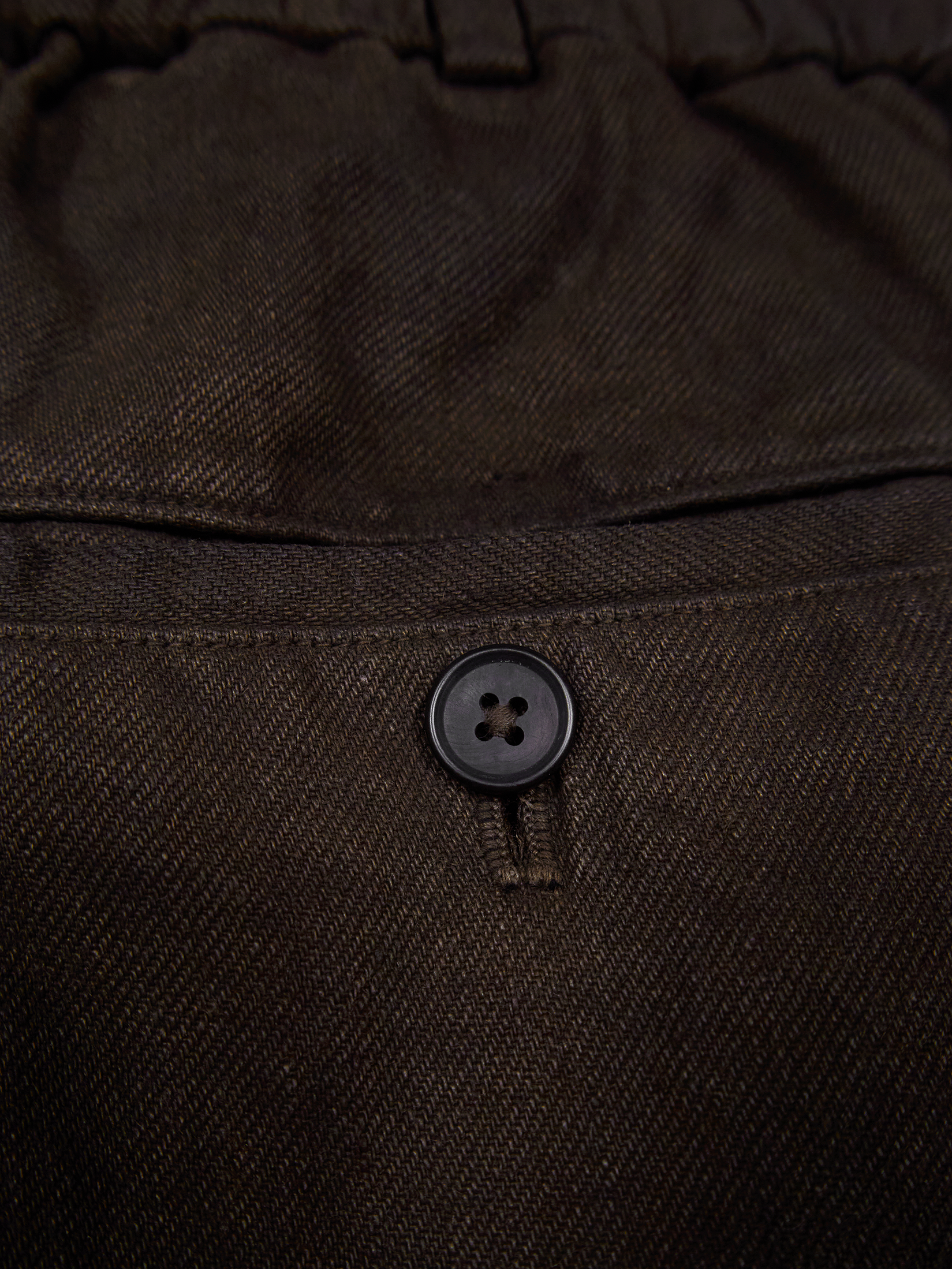 Fabriqué en sergé de lin tissé à haute densité avec du lin à gros fil provenant de France, teint à la boue à Amami Ōshima.