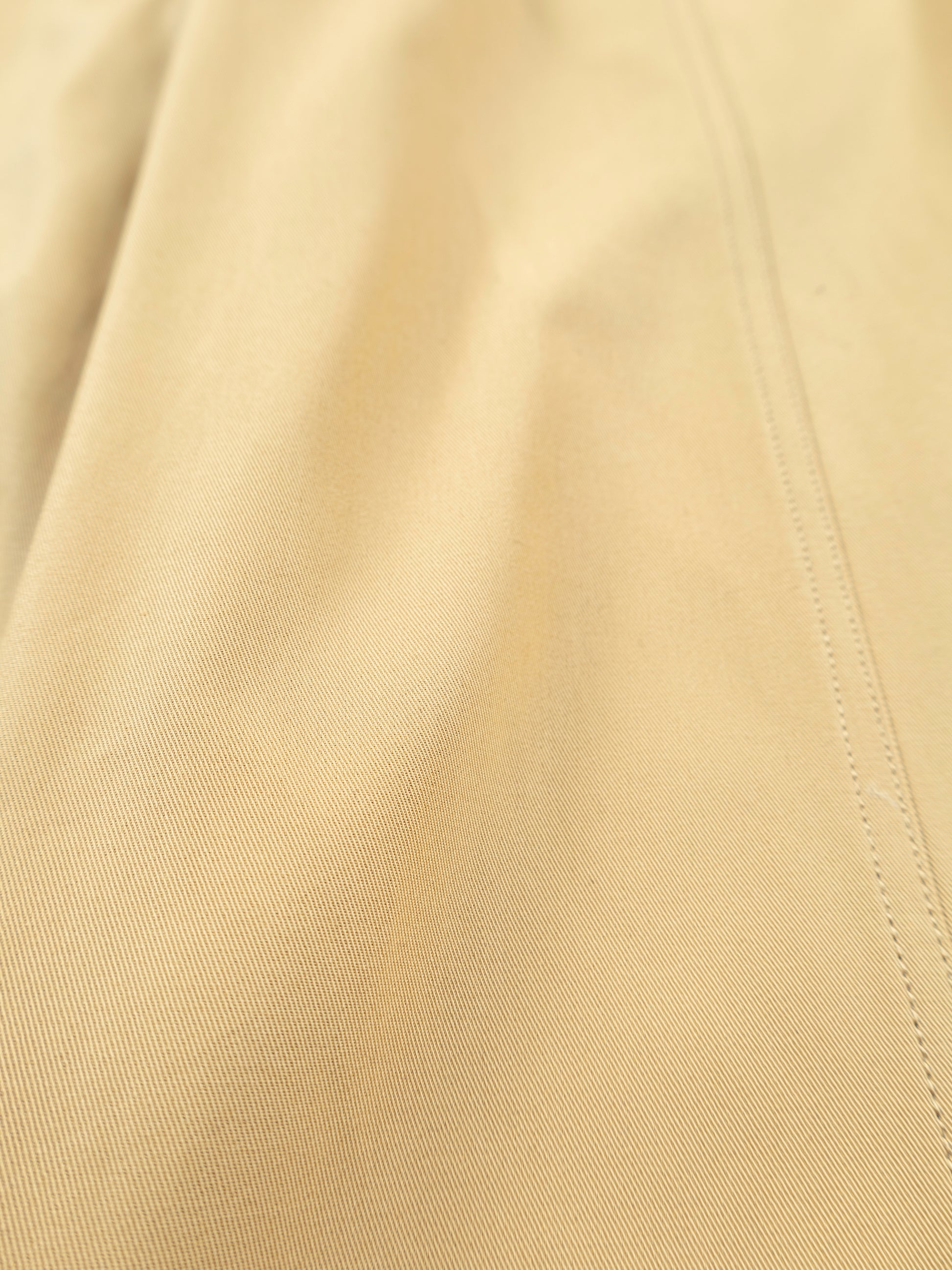 날실에는 삼중 꼬임의 핑크스 코튼 강연사를, 씨실에는 코튼 코마사를 사용하여 고밀도 개버딘 소재로 직조했습니다.