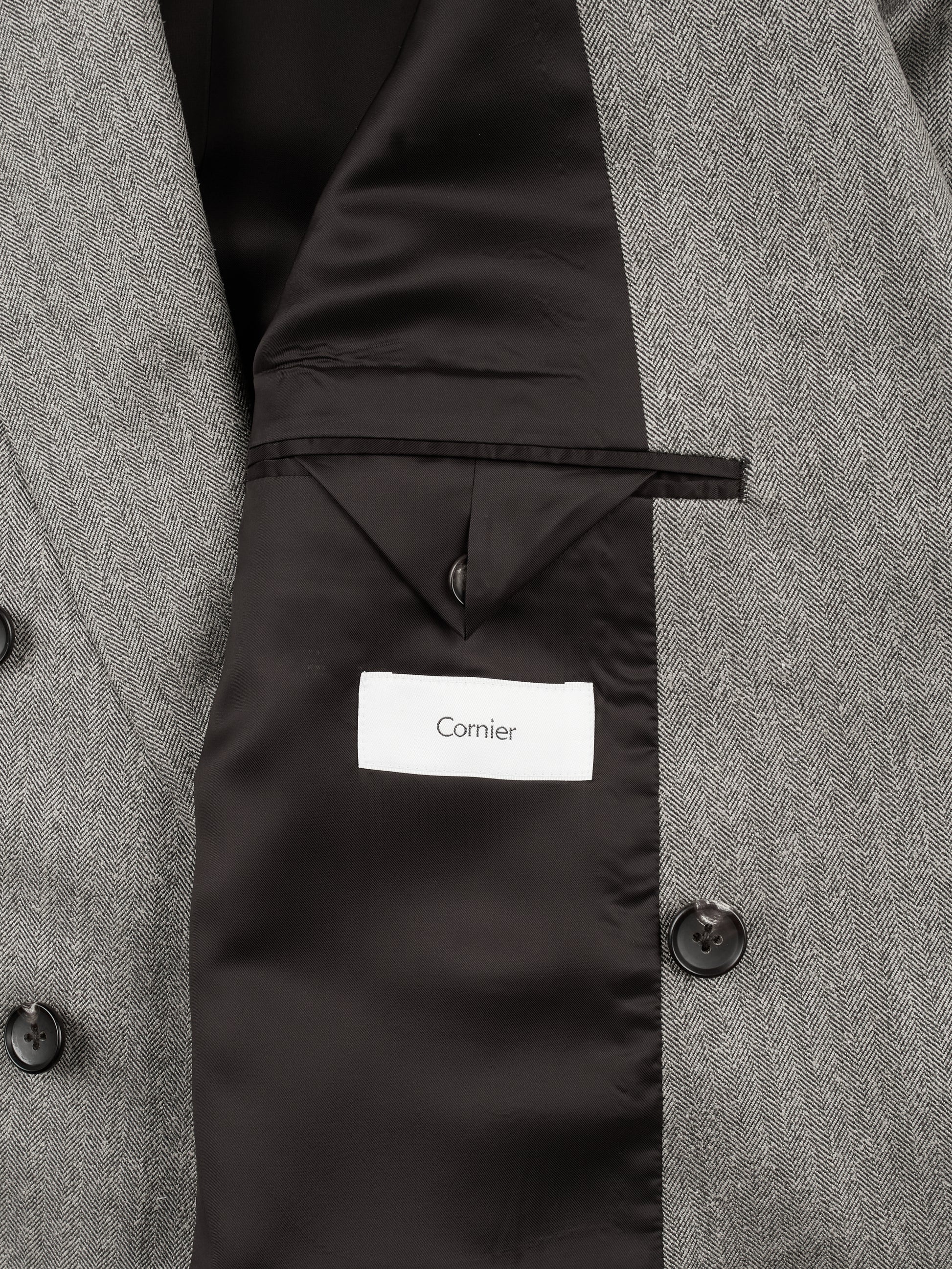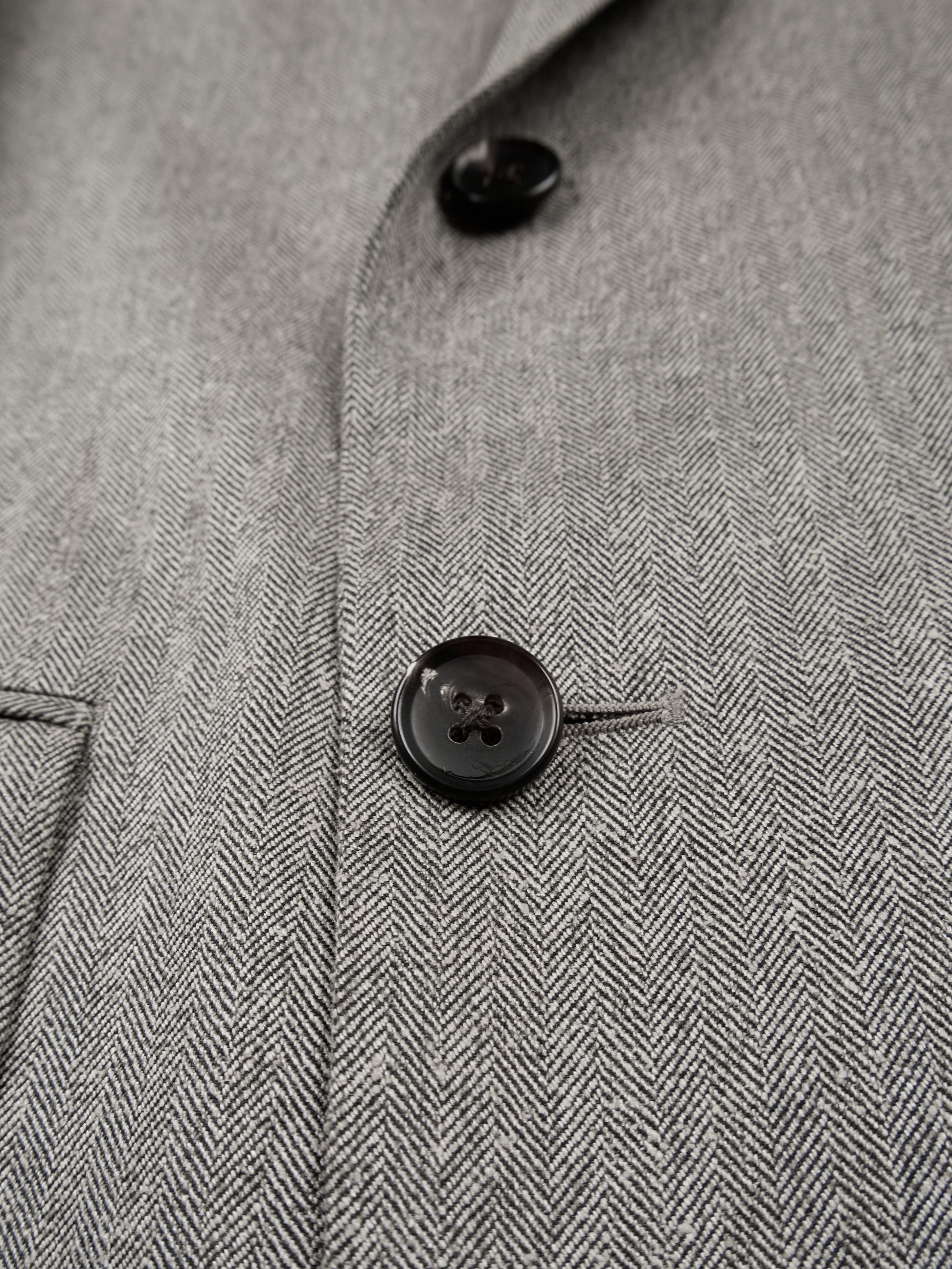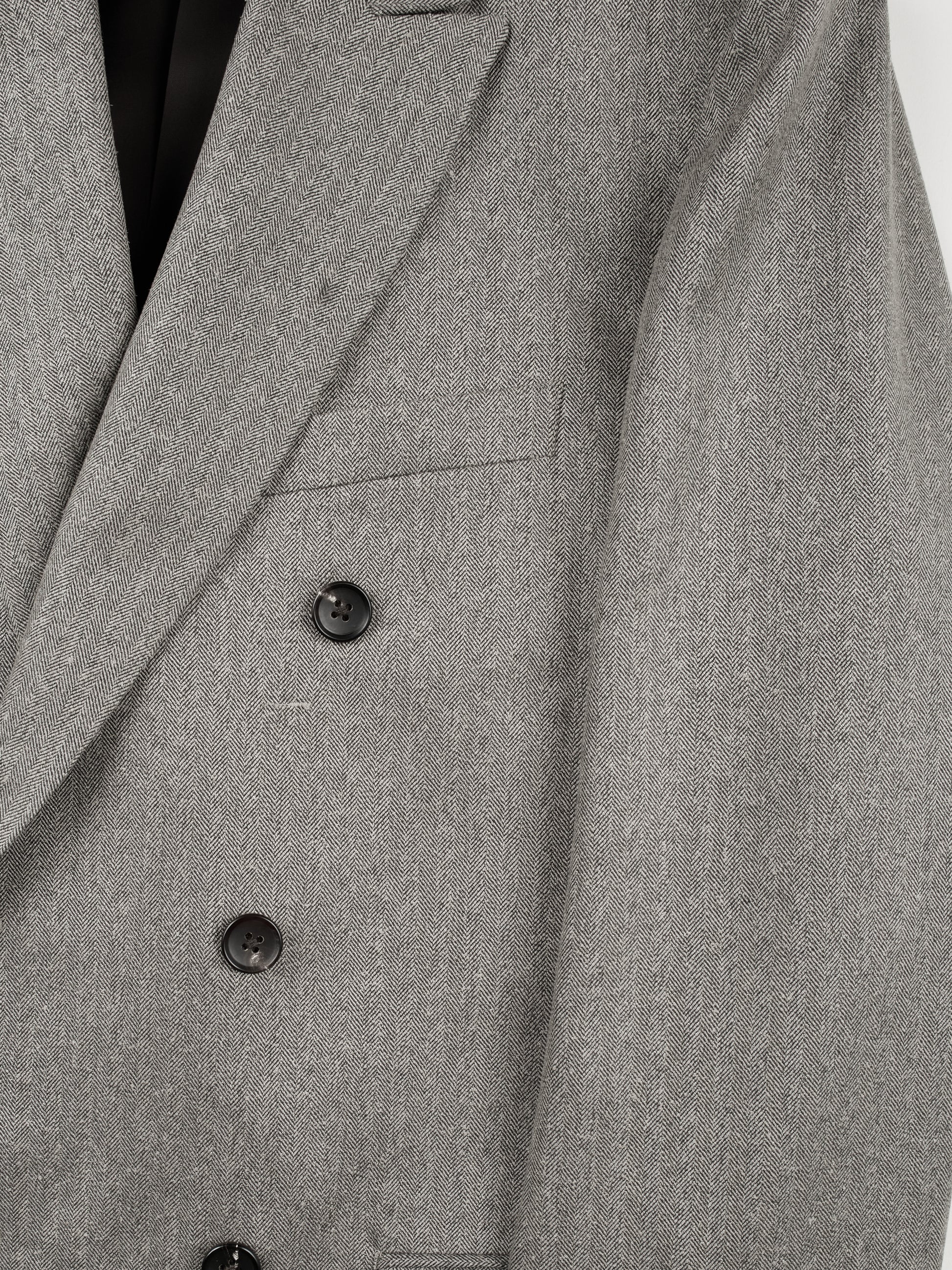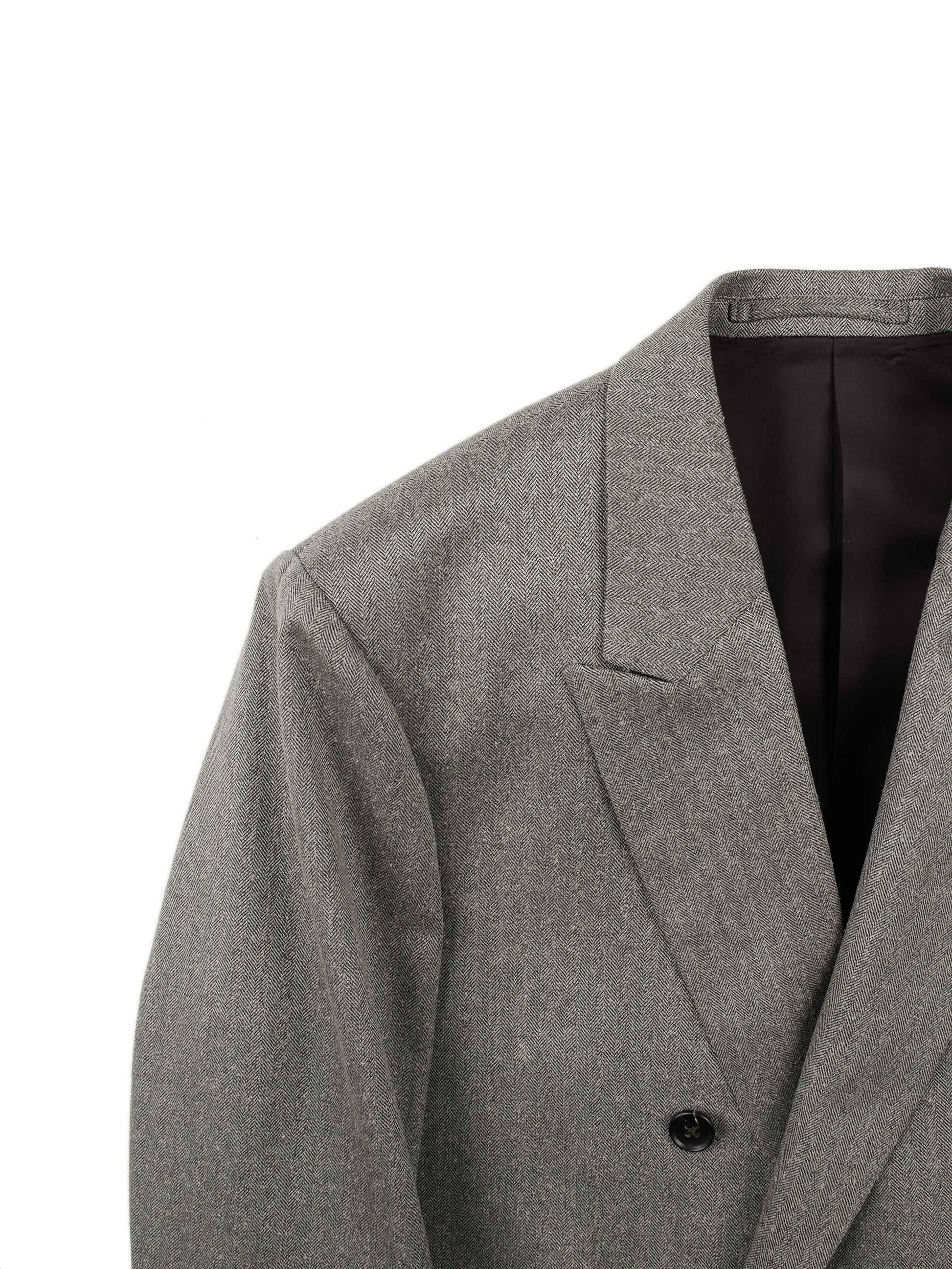 シルク紬糸とSP130'sランクのオーストラリア産メリノウールを使用したヘリンボン素材のダブルブレステッドジャケット。