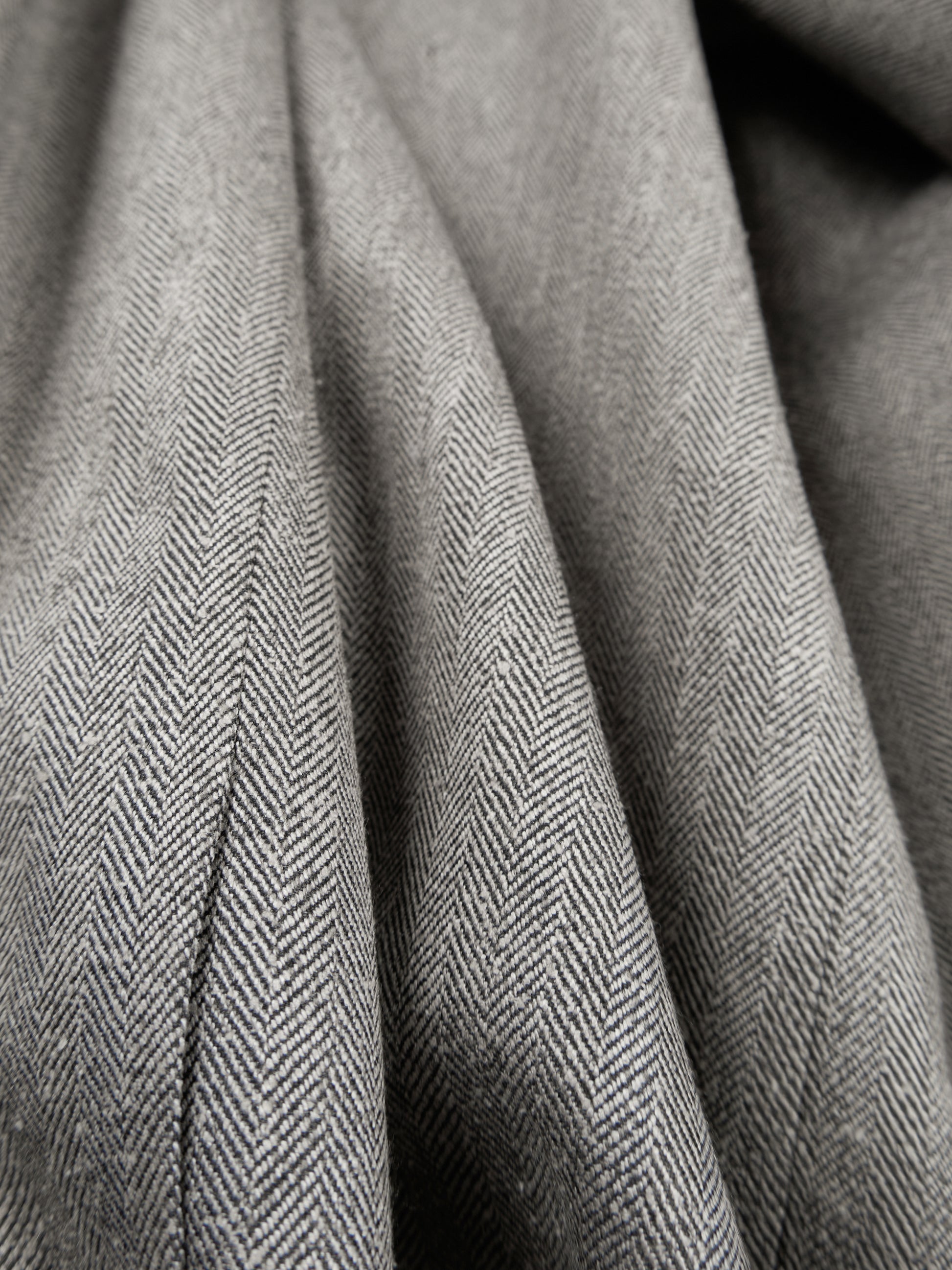 シルク紬糸と高繊度ウール梳毛糸を撚り合わせて撚り杢にしたオリジナルの糸を、ヘリンボン柄に織り上げています。