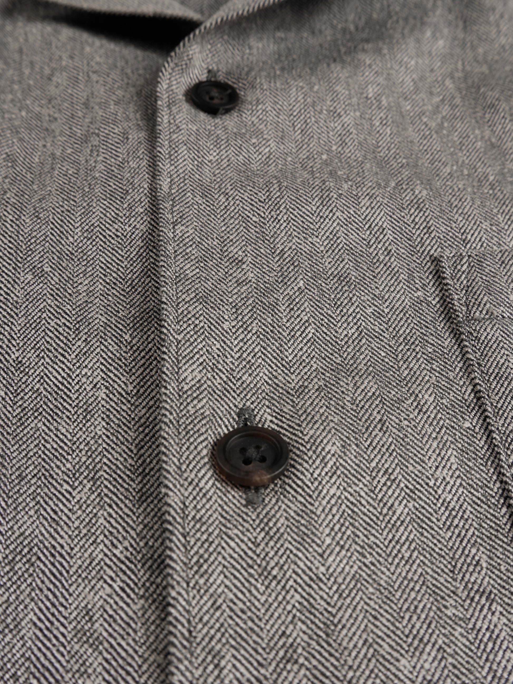 シルク紬糸とSP130'sランクのオーストラリア産メリノウールを使用したヘリンボン素材のオープンカラーシャツ。