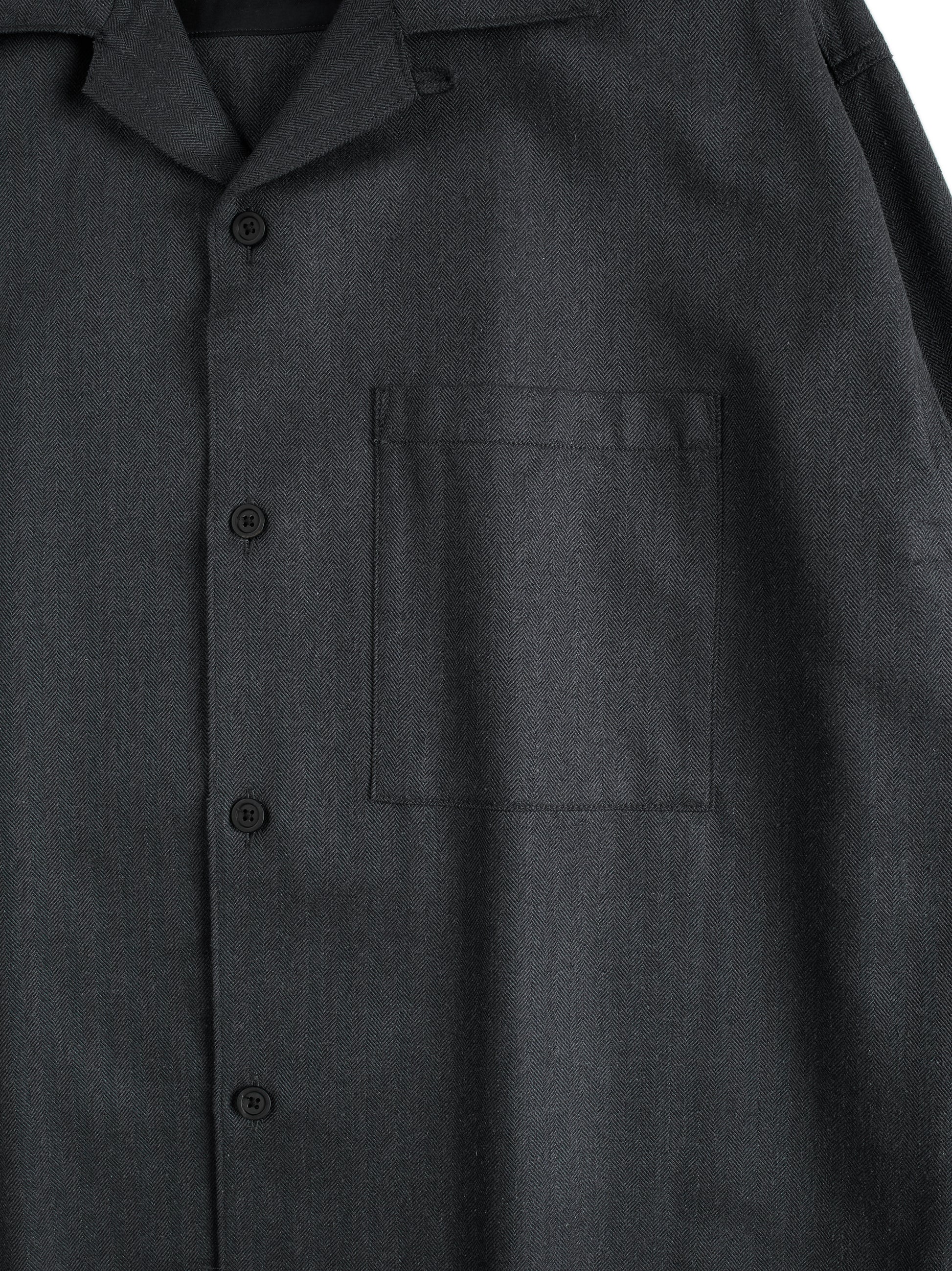 シルク紬糸とSP130'sランクのオーストラリア産メリノウールを使用したヘリンボン素材のオープンカラーシャツ。
