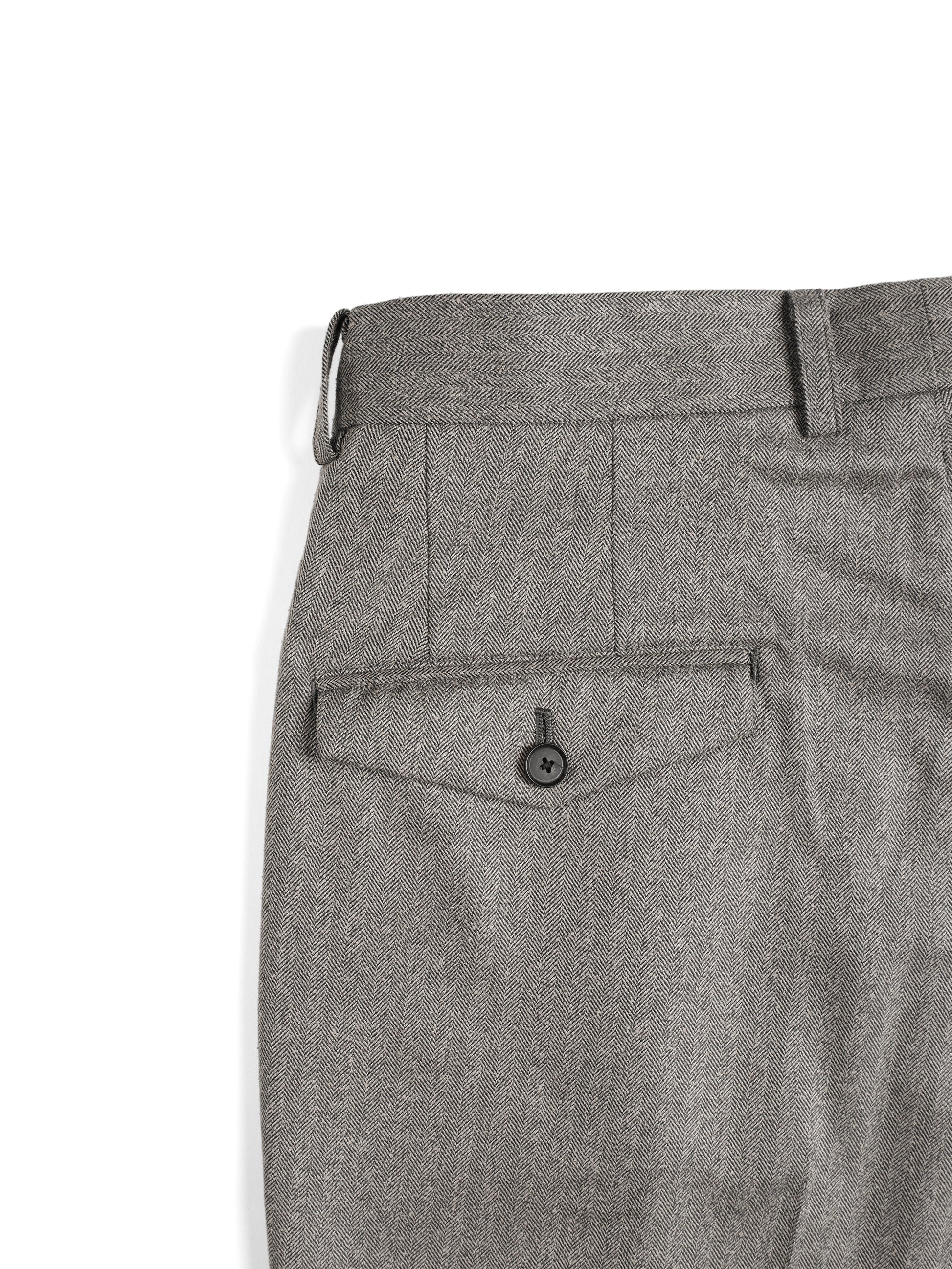 シルク紬糸とSP130'sランクのオーストラリア産メリノウールを使用したヘリンボン素材のスラックス。
