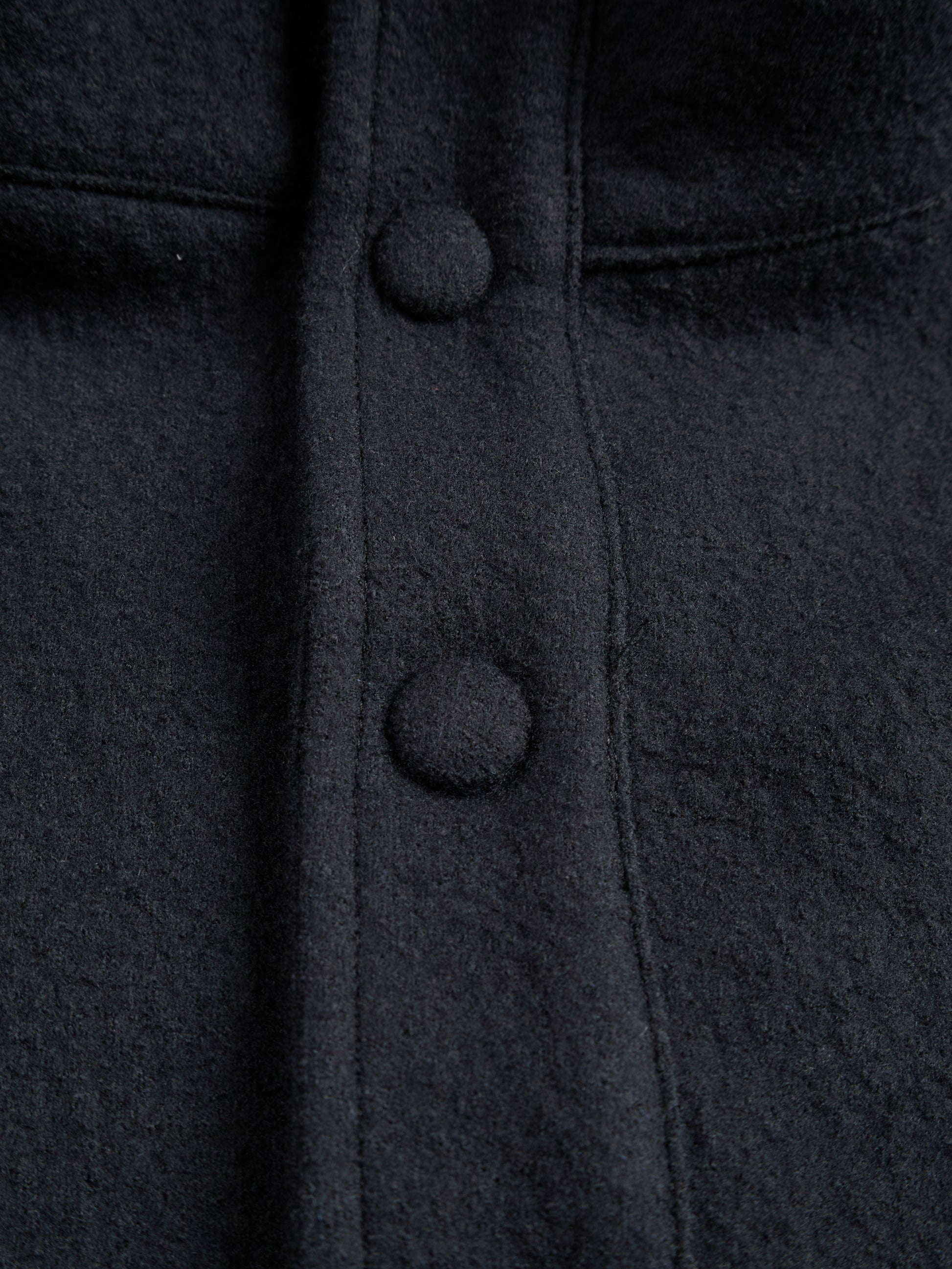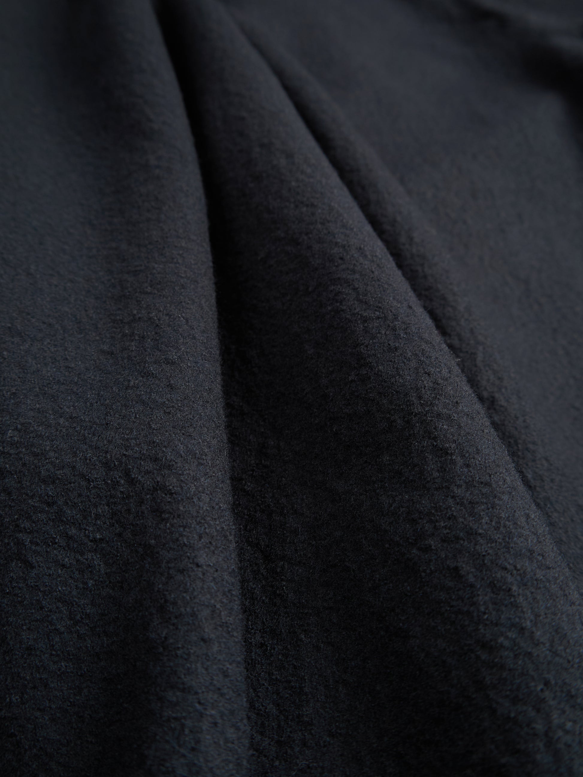 高繊度のウール梳毛原料を贅沢に使用し、仕上げに強いワッシャー加工をかけることで生地をフェルト化させ、表面に豊かな凹凸感を出しています。